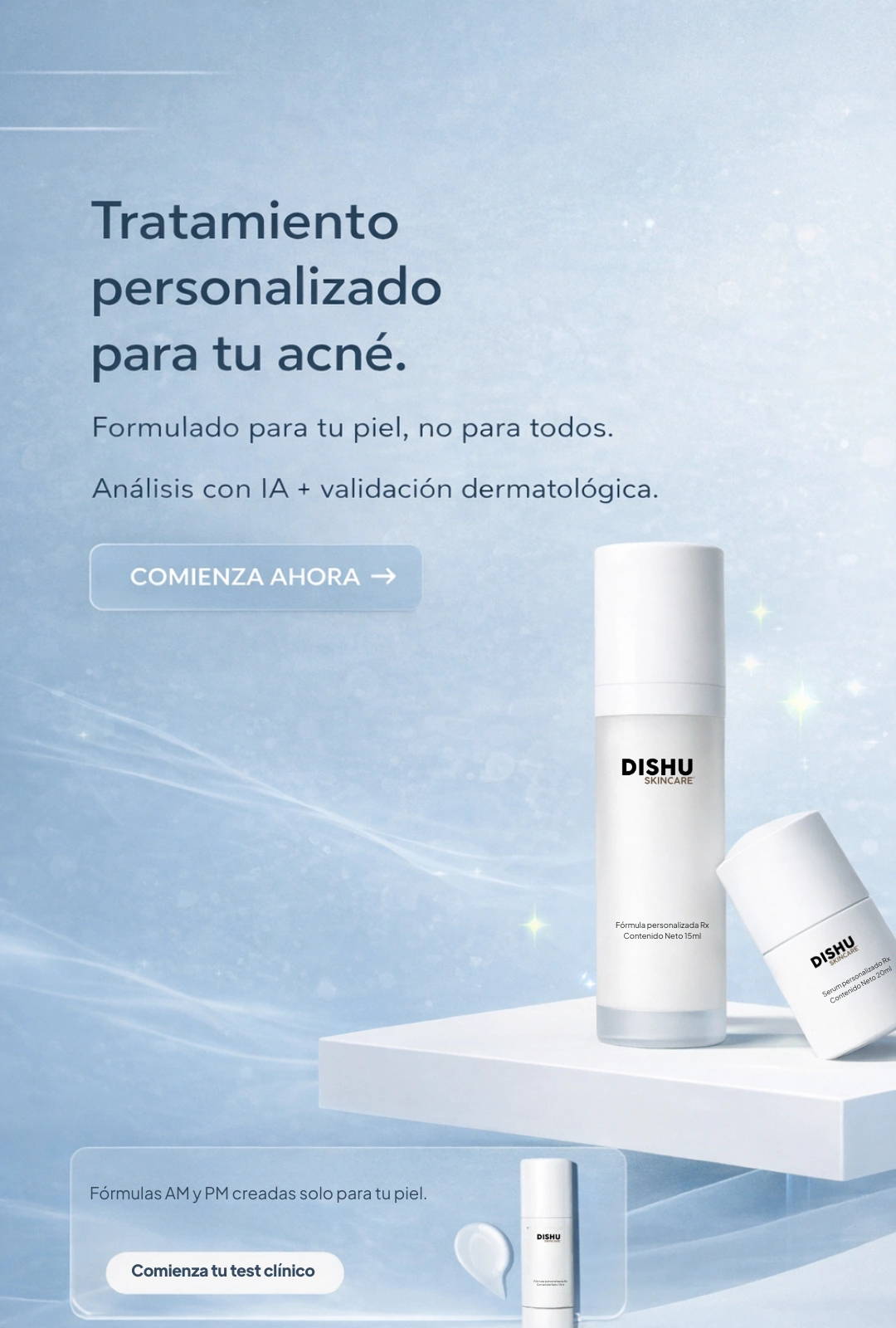 El cuidado de la piel no es igual para todos, y nosotros lo sabemos. Tu fórmula personalizada está creada específicamente para tus necesidades únicas, garantizando mejores resultados.
