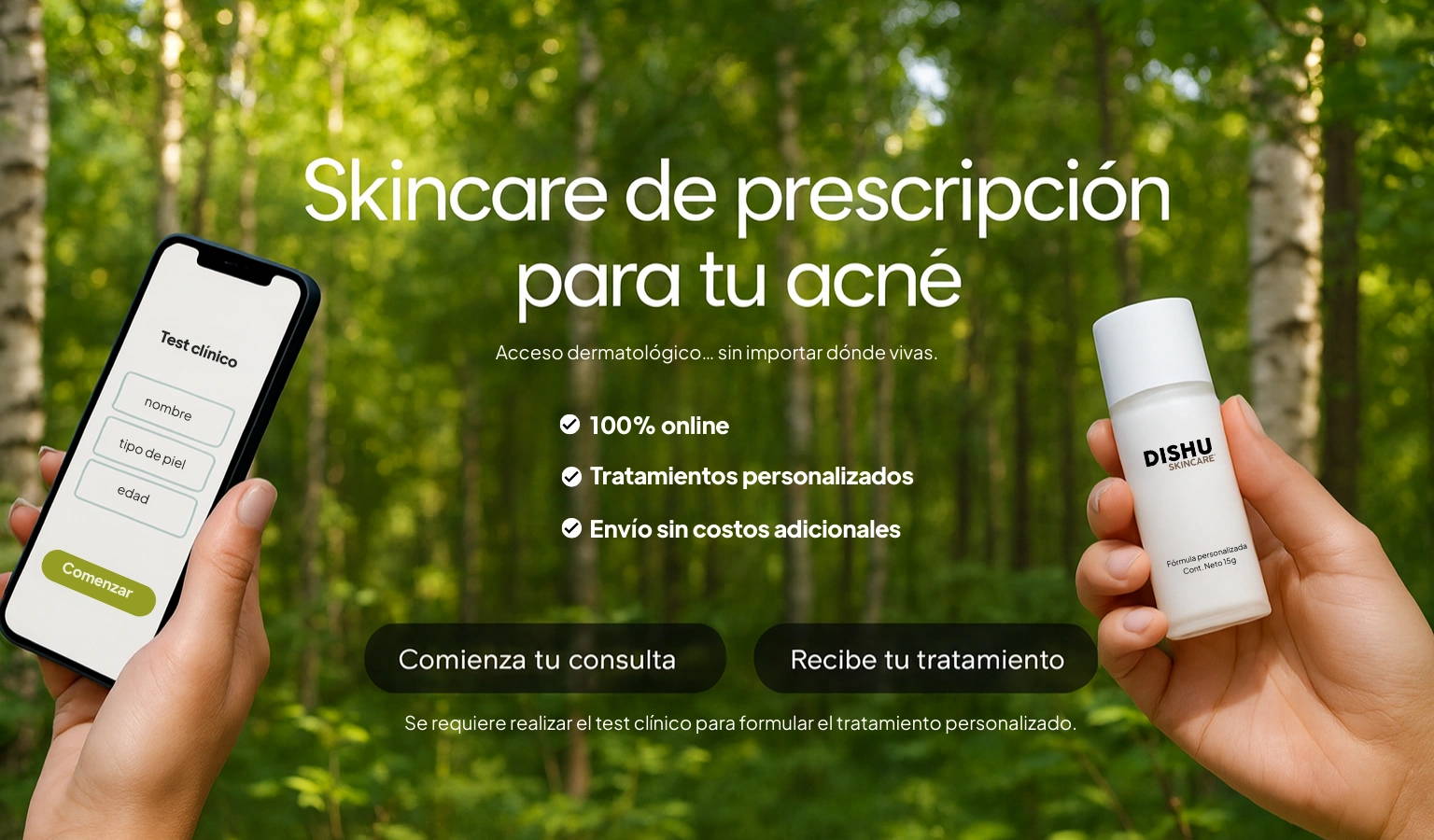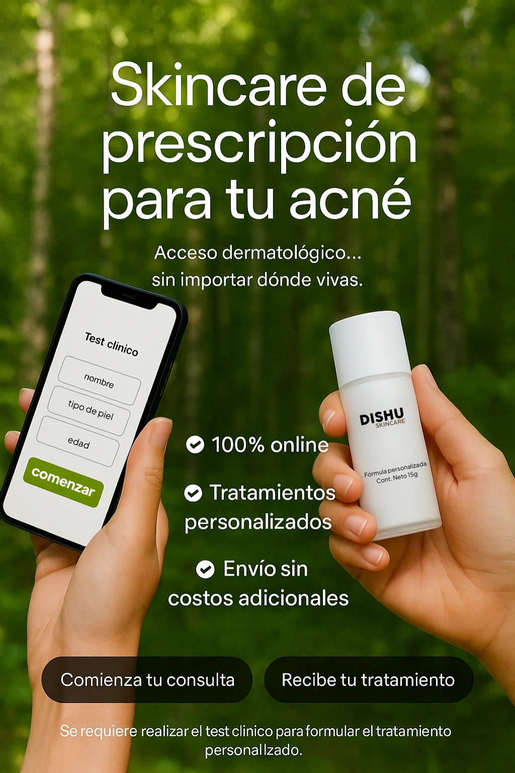 Dishu es un servicio de dermatología en línea que ayuda a garantizar que todos tengan acceso a un tratamiento efectivo para el acné. Lo hacemos evaluando tu piel a través de fotos que envías en línea. Junto con una consulta para conocer tu tipo de piel, nuestro equipo de dermatología utilizará tus fotos para diagnosticar con precisión y recetar el tratamiento adecuado que se ajuste a tu tipo de piel y preocupación.